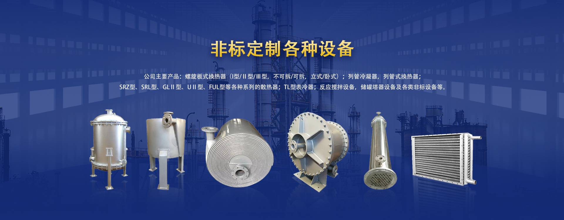 公司主要產(chǎn)品:螺旋板式換熱器(I型/Ⅱ型/Ⅲ型,不可拆/可拆,立式/臥式);列管冷凝器,列管式換熱器;SRZ型、SRL型、GLⅡ型、UⅡ型、FUL型等各種系列的散熱器;TL型表冷器;反應(yīng)攪拌設(shè)備,儲罐塔器設(shè)備及各類非標(biāo)設(shè)備等。
